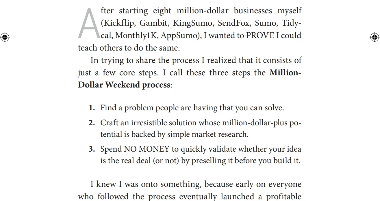 Million Dollar Weekend is a guide by serial entrepreneur and AppSumo CEO Noah Kagan on how to create your own million-dollar business in 48 hours.